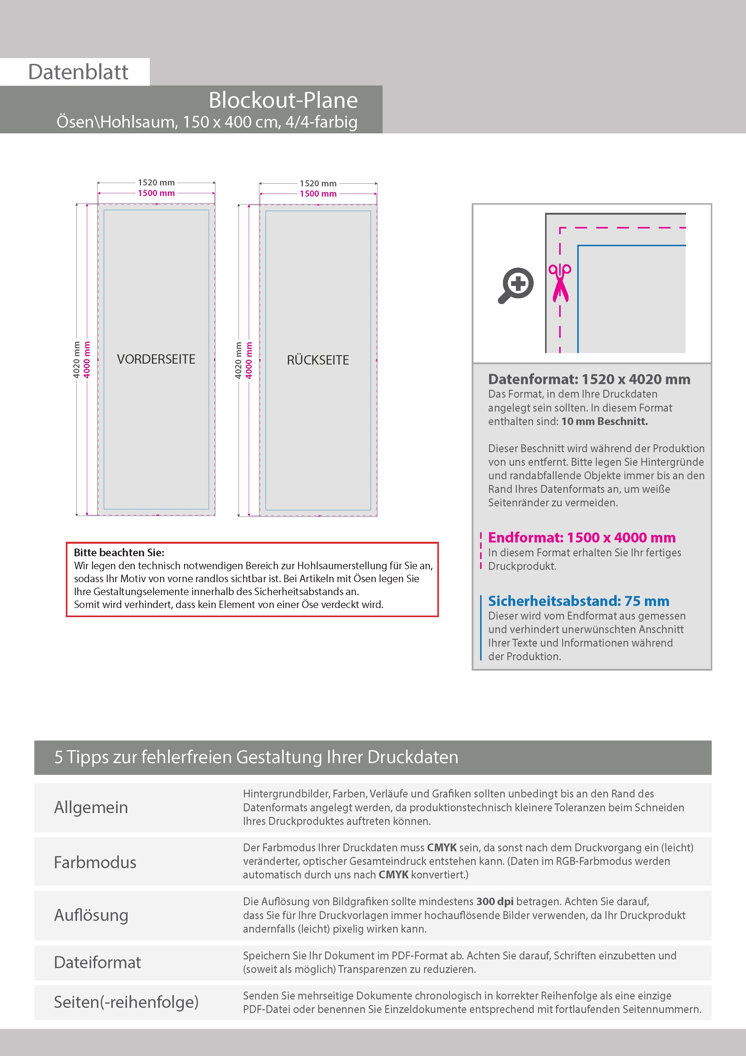 Hochwertige Blockout-Plane 150 x 400 cm, 4/4-farbig bedruckt, Ösen im Abstand von 50 cm rundum